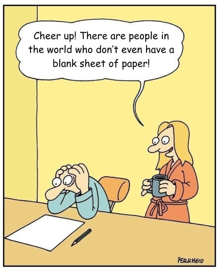 This cartoon hits writers and creatives right in the feels. A man stares blankly at an empty page, clearly deep in a spiral of self-doubt. Enter the chipper woman with a mug of coffee, delivering the world’s most tone-deaf pep talk: “Some people don’t even have a blank sheet of paper!” The mismatch of existential dread and faux-positivity creates an ironically wholesome, yet biting scene. It’s a painfully relatable jab at toxic optimism wrapped in polite encouragement.