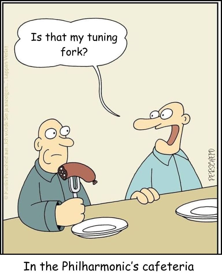 Only in a world as bizarre as this one could someone use a tuning fork to spear a sausage. Set in a Philharmonic cafeteria, this cartoon blends classical music with culinary chaos. The man’s blank expression and his friend’s casual accusation add a delightful absurdity to the scene. The humor lies in the dead-serious delivery of a completely insane situation, making it a pitch-perfect example of Perscheid’s gift for turning highbrow culture into low-key ridiculousness.