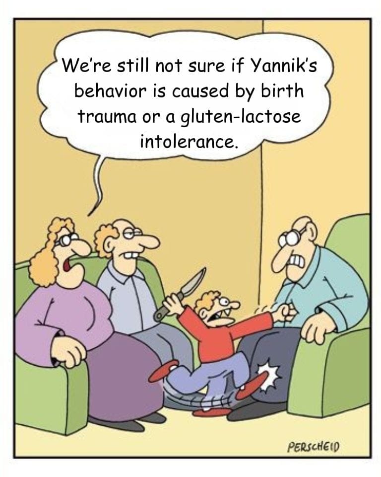 Here we have modern parenting in full denial. As a violent child aggressively stabs a seated adult with a kitchen knife, his parents calmly debate whether his behavior stems from a birth trauma or gluten-lactose intolerance. The complete absurdity of ignoring the actual problem while clinging to trendy diagnoses makes this cartoon painfully hilarious. It skewers contemporary over-psychoanalysis with a touch of chaos, proving once again that sometimes, the real issue is right in front of you—wielding a blade.
