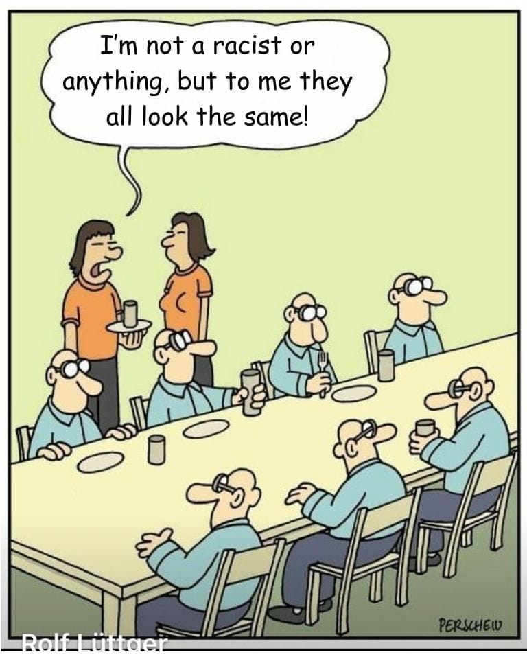 At a long table of nearly identical bald men with glasses, a server whispers to a colleague, “I’m not a racist or anything, but they all look the same!” This cartoon plays on the awkwardness of social assumptions and visual stereotypes, flipping the joke on its head. The identical outfits and expressions create a comically creepy clone army, while the punchline pokes at misguided attempts to be politically correct. It’s uncomfortably funny—just the way dark humor cartoons should be.
