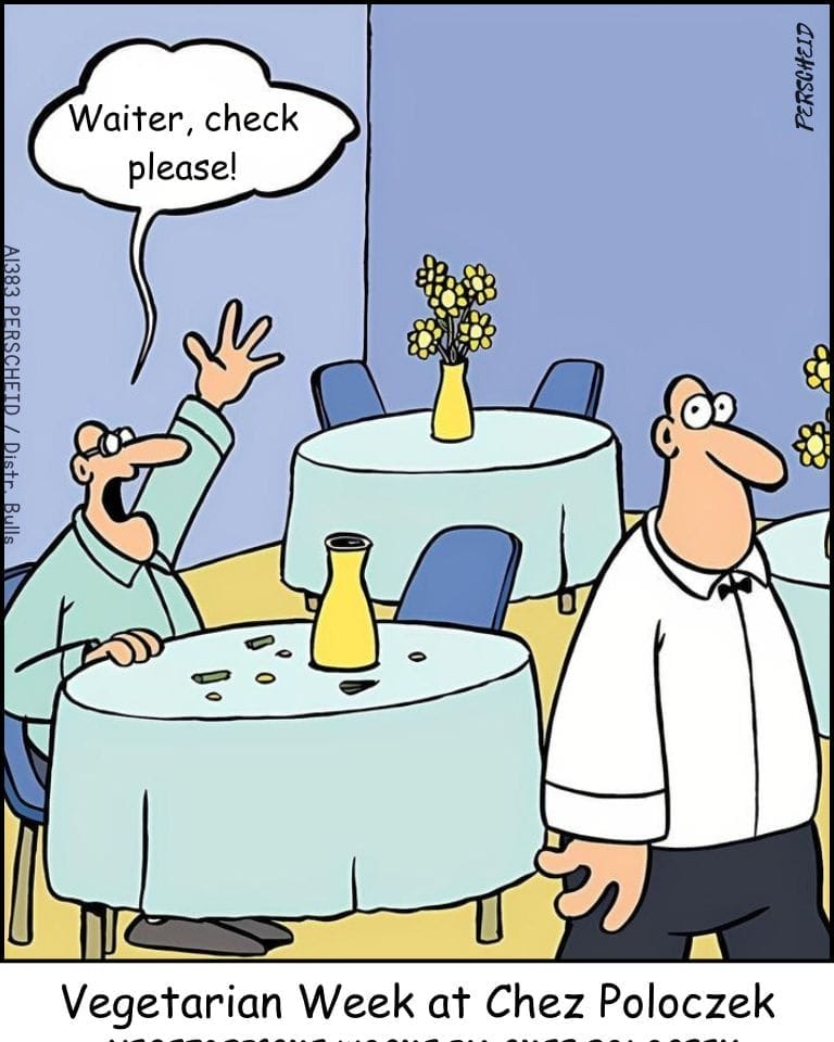 A diner raises his hand to leave a vegetarian restaurant—his plate comically bare. “Check, please!” he exclaims, as the caption reveals it’s Vegetarian Week at Chez Poloczek. This cartoon is a sly dig at haute vegetarian cuisine that leaves you spiritually fulfilled—but physically starving. The humor comes not just from the emptiness of the plate, but the man’s polite, almost resigned despair. Perfect for anyone who’s ever suffered through a garnish masquerading as a main course.