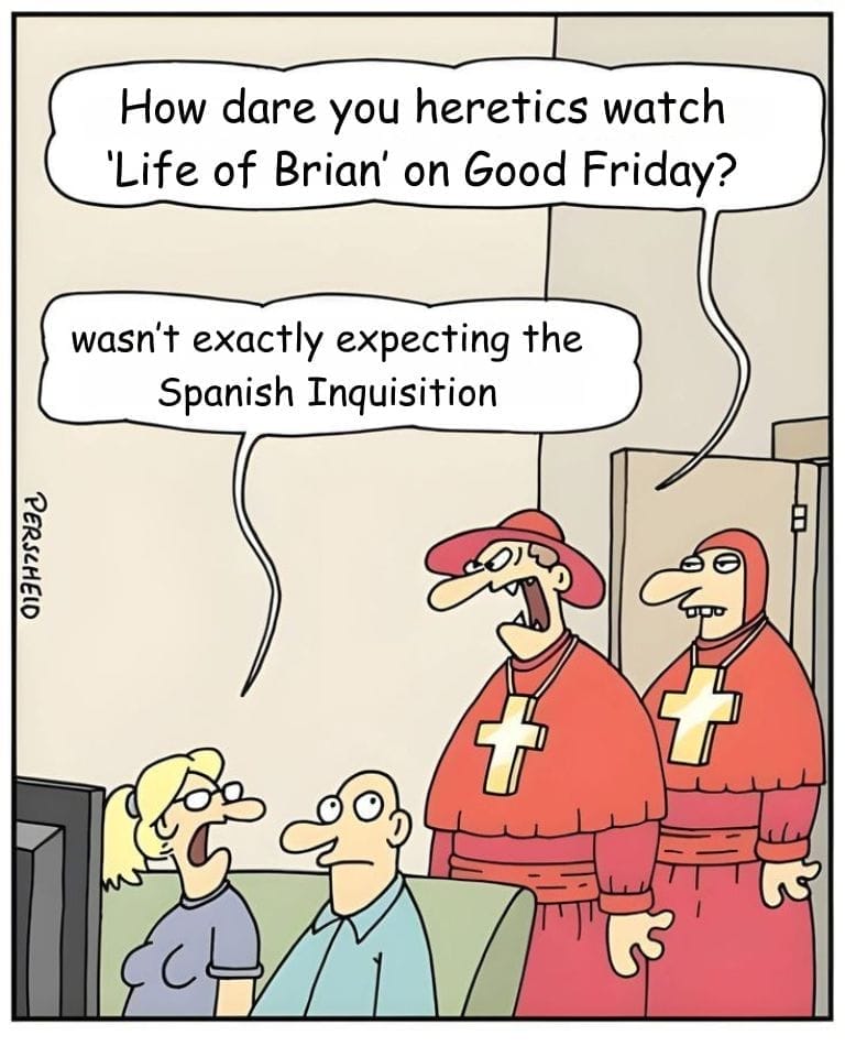 Two people watching Life of Brian on Good Friday are suddenly interrupted by the Spanish Inquisition. “How dare you heretics…” one inquisitor screams, while the viewer calmly replies, “Wasn’t exactly expecting the Spanish Inquisition.” Monty Python meets medieval menace in one hilariously blasphemous gag.