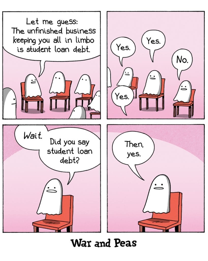 Turns out student loans follow you into the afterlife. That’s it. That’s the horror. It’s the most relatable ghost story you’ll ever read.