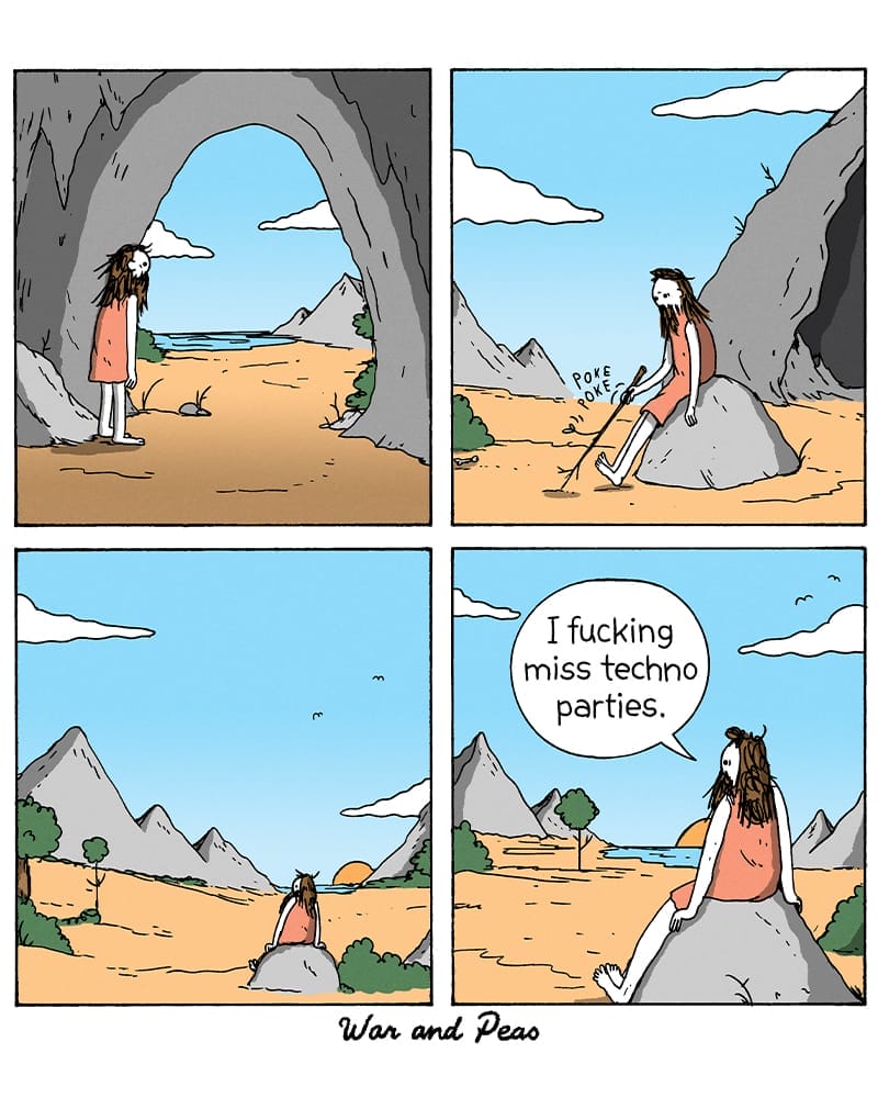 A solitary cave dweller gazes into the distance, reflecting on modern woes. What does he miss most? Raves. A comic that’s oddly poetic — and very sweaty.