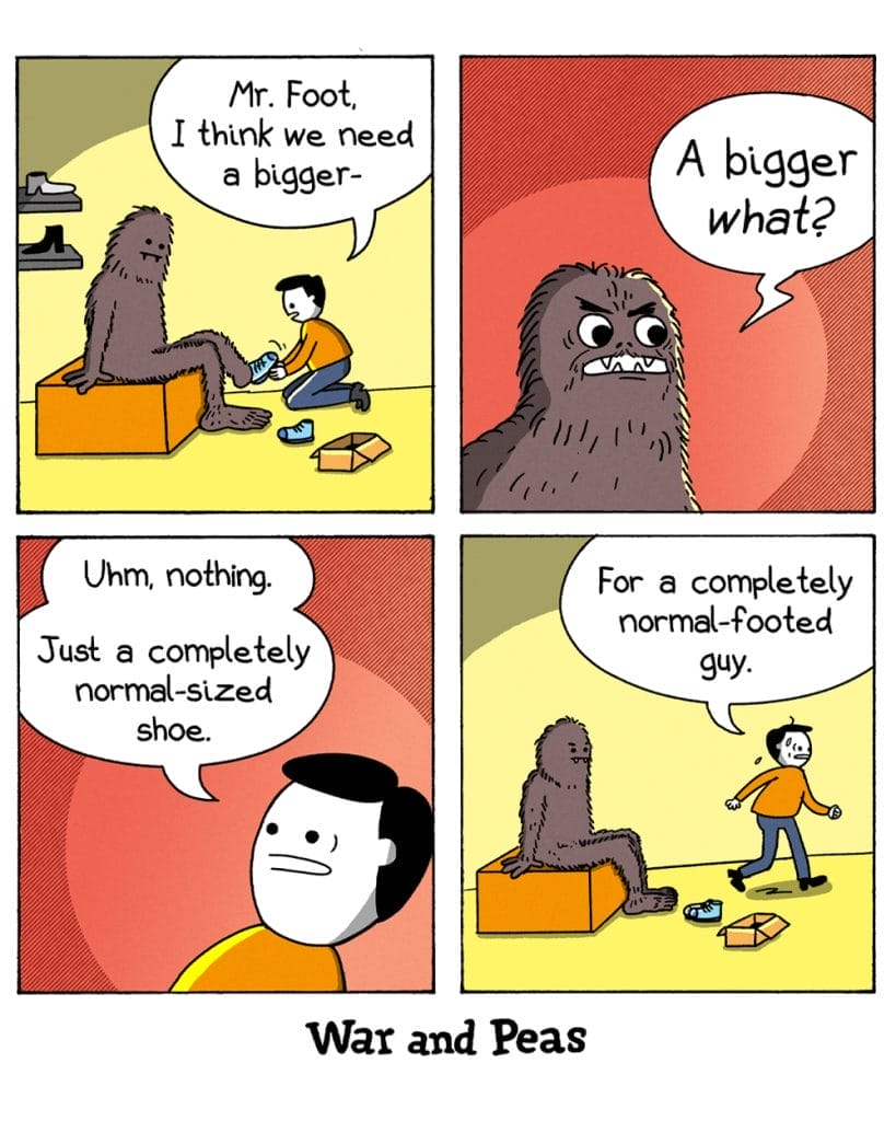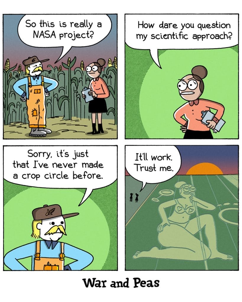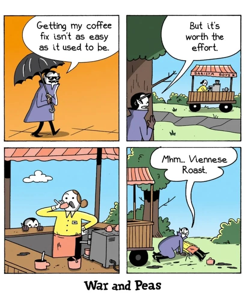 War and Peas is the brainchild of German comic creators Elizabeth Pich and Jonathan Kunz, a duo with a deliciously dark sense of humor. Their comic strip started in 2011 and has since evolved into a global cult favorite — gracing web platforms, anthologies, and even The New Yorker. Their signature style? Simple, clean illustrations that contrast brilliantly with themes like mortality, loneliness, technology, and existential dread. It’s pastel-colored nihilism at its finest — think Far Side meets BoJack Horseman.