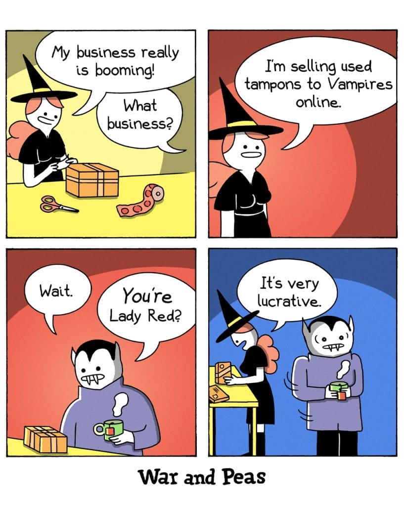 A witch is selling tampons to vampires. Yes, really. It’s disturbing, lucrative, and painfully on-brand for War and Peas.