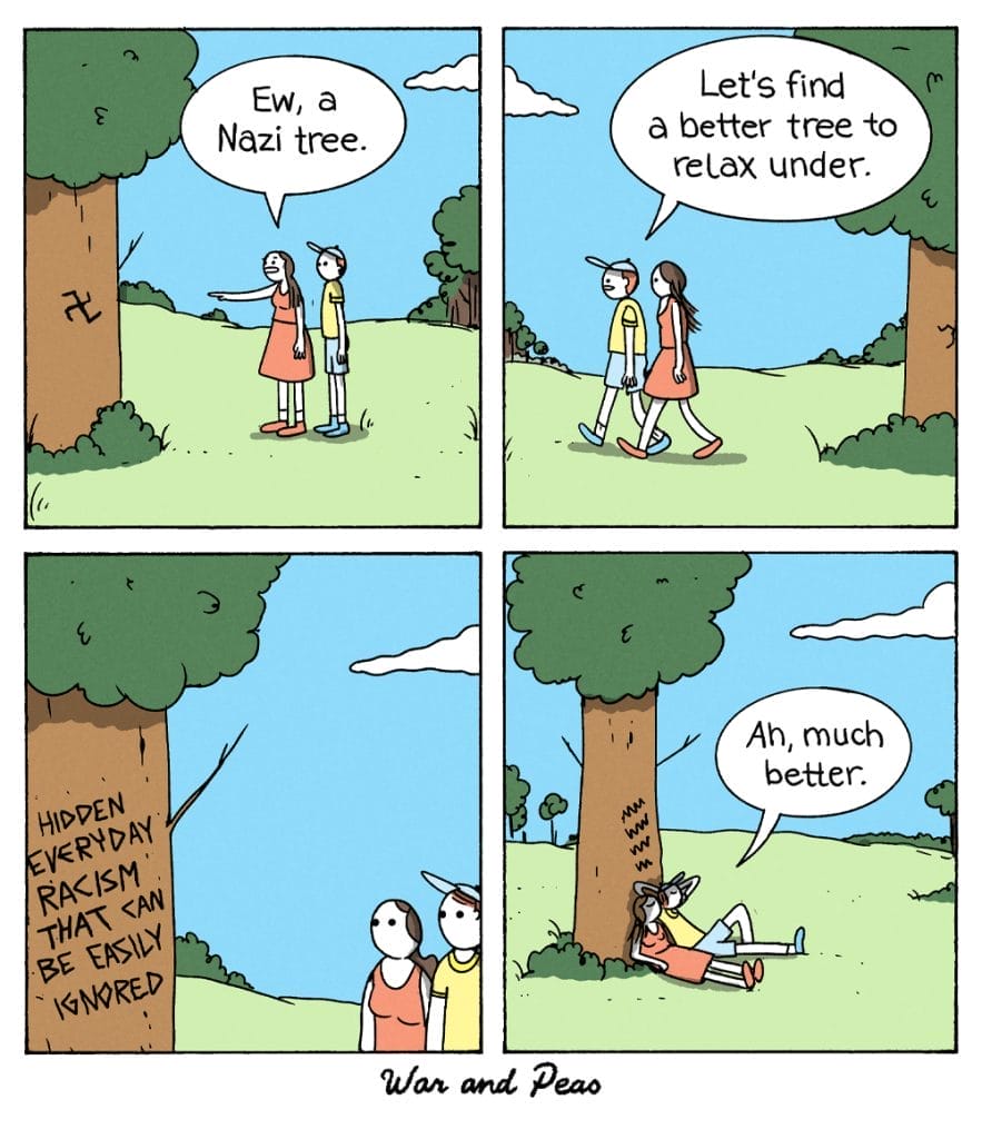 A couple avoids a tree carved with a swastika… only to chill under one marked “hidden everyday racism.” The irony hits hard. Satire done right.