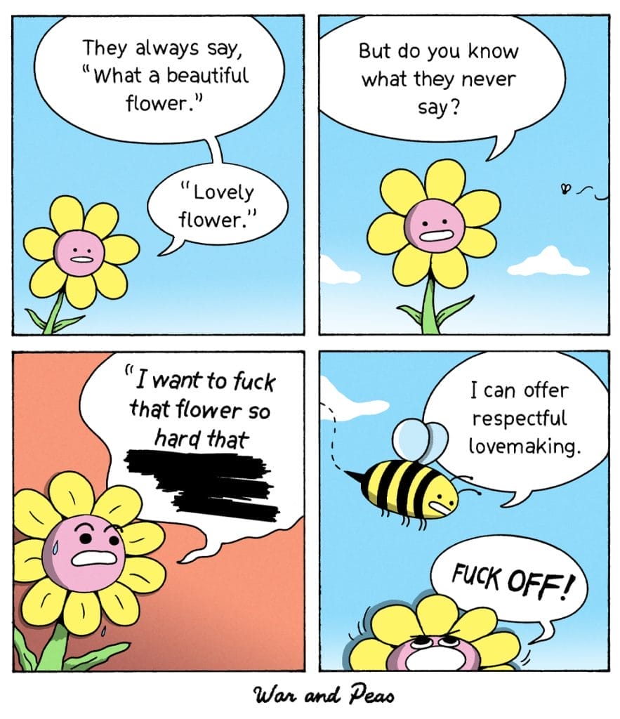 This comic starts with romantic nature vibes and then detours straight into uncomfortable territory. Luckily, the bee brings consensual comedy to the rescue.