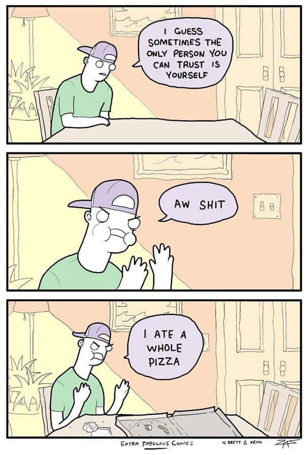 When you’re the only person you can trust — and you still fail yourself. This comic captures the self-sabotage spiral in a painfully relatable and laugh-out-loud format. Bonus points for the pizza.