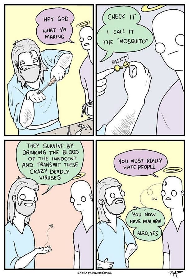 Ever wonder why mosquitos exist? This comic gives you the divine answer, and it’s as brutal as it is hilarious. A masterclass in dark theology and insect-related existential dread.