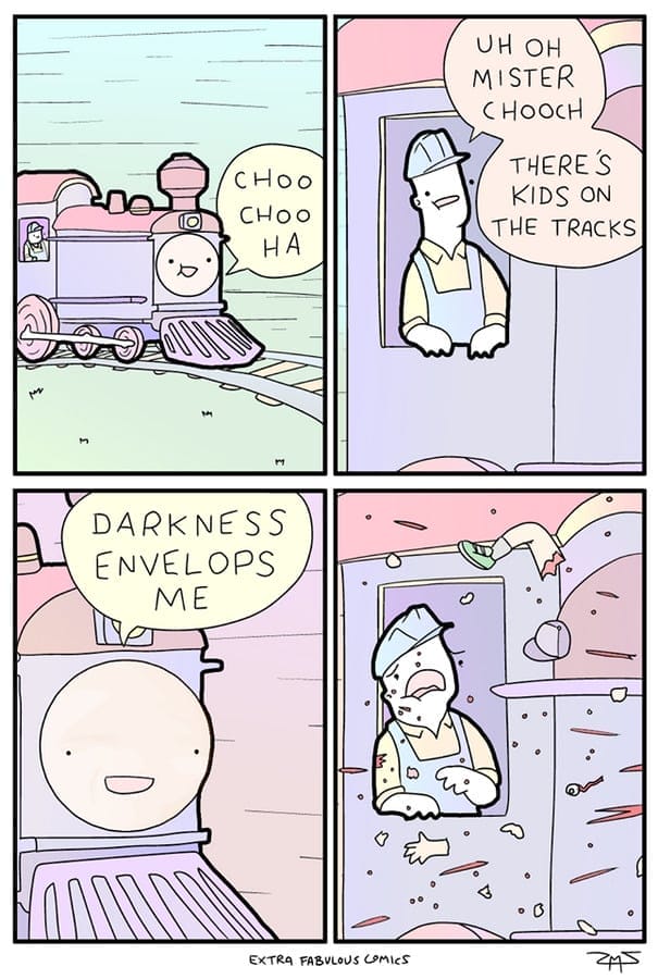 Choo choo… straight to the shadows. A sentient train loses it in the most unhinged way possible. What starts as a whimsical journey derails (literally) into psychotic laughter.