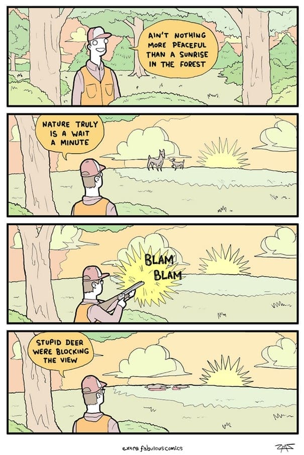 A hunter is trying to enjoy nature’s beauty… until wildlife ruins the view. So he does what any Extra Fabulous character would do — he opens fire. Beautiful, ridiculous logic.