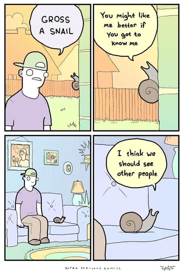 It starts with “Gross, a snail” and ends with heartbreak. This comic is a slow burn, literally, and features a tragic breakup with an invertebrate. Somehow, it’s both emotionally crushing and hilarious.