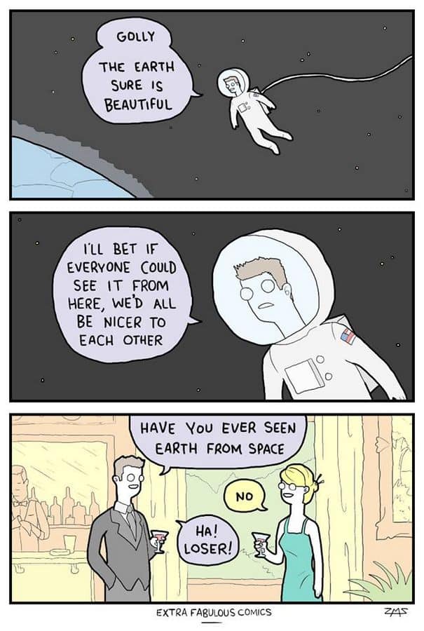 An astronaut’s poetic epiphany gets annihilated by a smug cocktail party guest. This comic is a galactic-level mood killer that roasts both idealism and social snobbery. Perfectly petty.