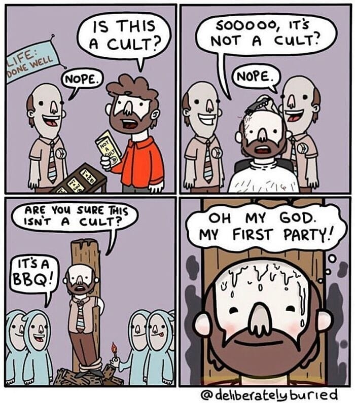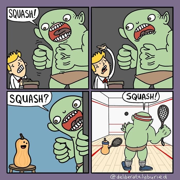 Deliberately Buried Comics is a web comic created by artist Sean Berthiaume. It is known for its unexpected turns and dark comedy. He is a known creator of dark humor comics that will make you laugh and feel a little uneasy. Each comic depicts an apparently ordinary scenario that takes a strange turn. Over 96,700 people have followed his Instagram account, and they are all excited to see what wonderfully dark humor masterpiece he will come up with next.