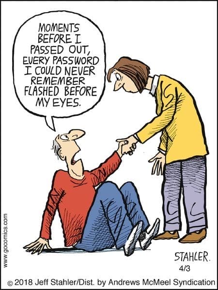 In a final punchline, a man claims he saw all his forgotten passwords flash before his eyes as he fainted. Stahler captures tech anxiety hilariously.