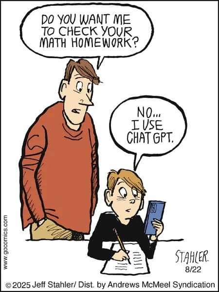 One of Stahler’s most timely panels—kids skipping parental help and turning straight to AI. It’s a clever commentary on how fast tech has entered everyday life.