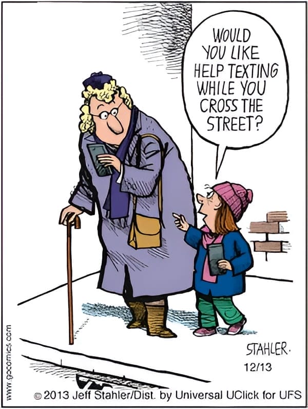 A little girl offers to help an elderly woman text while crossing. It’s funny, ironic, and captures our obsession with screens perfectly.