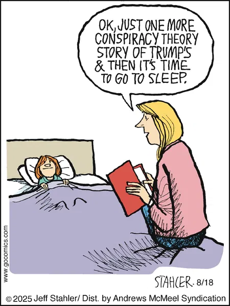 A mom promises “just one more Trump conspiracy” as a bedtime story. Bold, political, and absurd—classic Stahler satire.