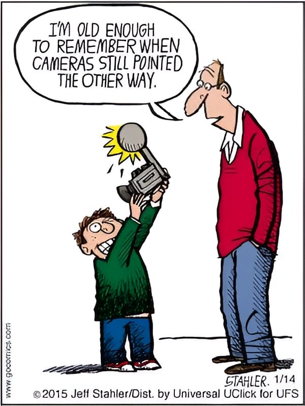 A boy marvels at how cameras “used to point the other way.” A quick, witty jab at how selfies dominate our times.