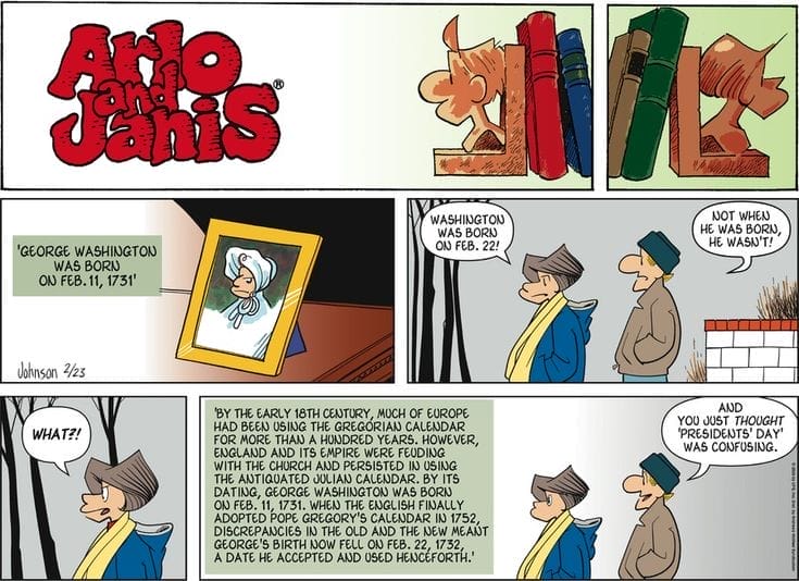 A casual conversation about George Washington’s birthday spirals into a full-blown calendar reform history lesson. Arlo’s “WHAT?!” says what we’re all thinking. The punchline—“You just thought Presidents’ Day was confusing”—wraps this one in clever historical chaos that’s perfect for family banter.