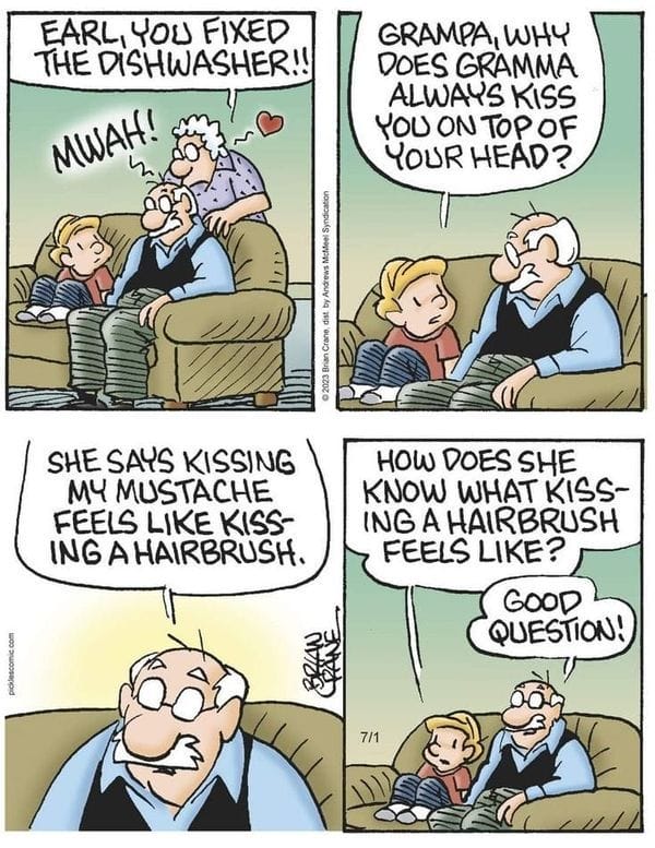 Kissing Grampa feels like kissing a hairbrush, apparently. The punchline? Nobody knows how Gramma discovered this fascinating fact.