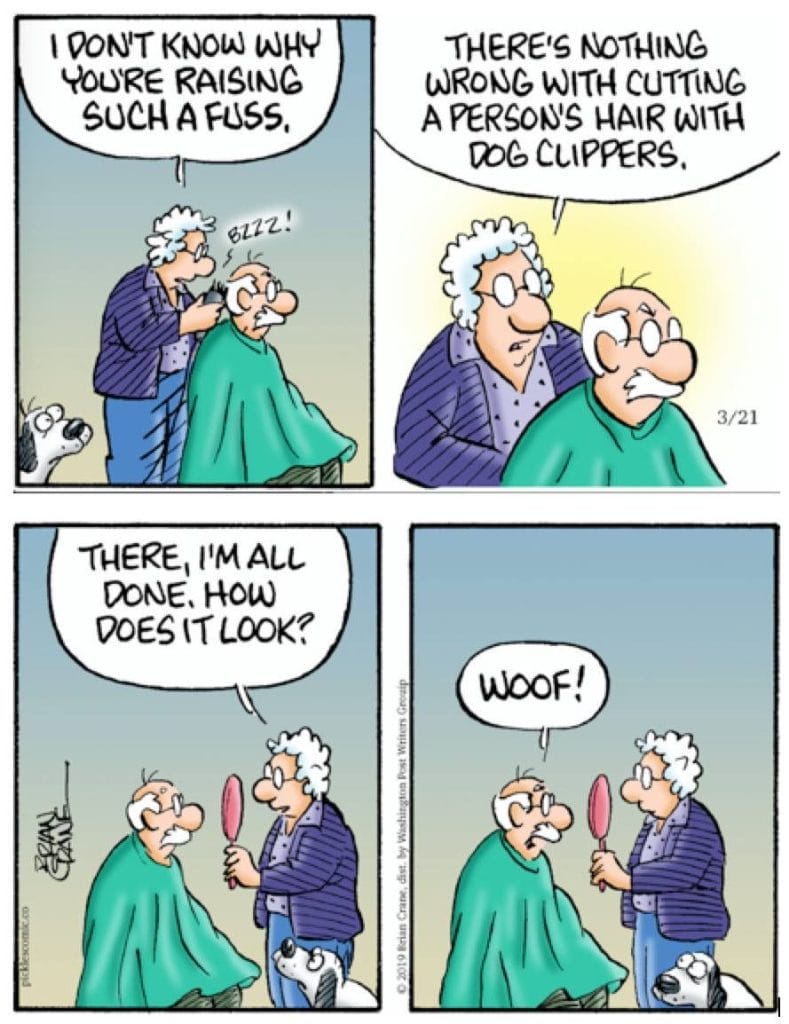 Earl gets a haircut with dog clippers—finishing with a “woof!” Family humor cartoons: reminding us never to trust a spouse with grooming tools.