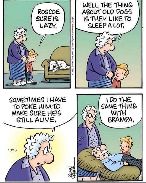 Old dogs and Grampas both like to nap. Sometimes, you have to poke them to make sure they’re still alive. Now that’s a family tradition!