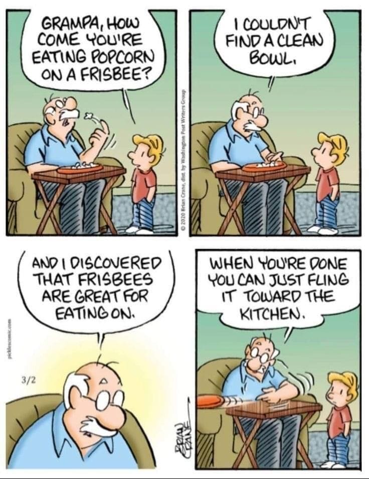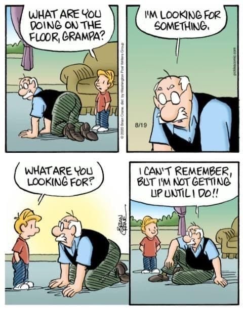 What is Grampa looking for on the floor? He doesn’t remember, but he refuses to give up. If this isn’t peak family humor cartoon material, nothing is.