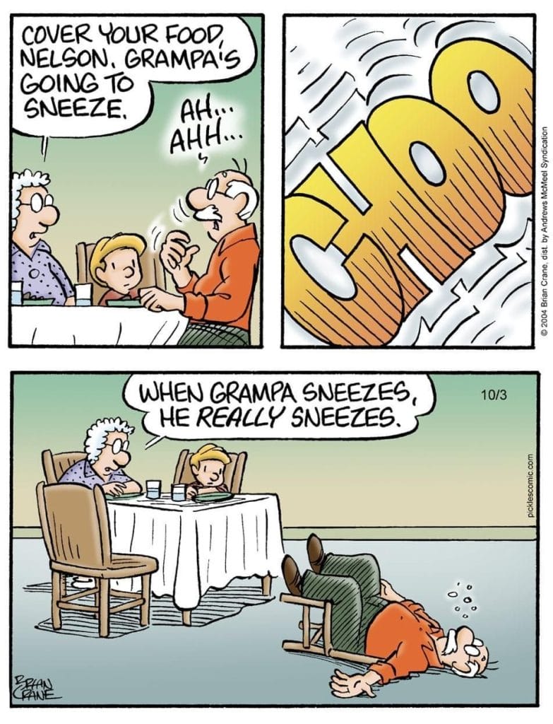 When Grampa sneezes, it’s a force of nature. The visual of Earl blown out of his chair will have allergy sufferers (and their families) howling.