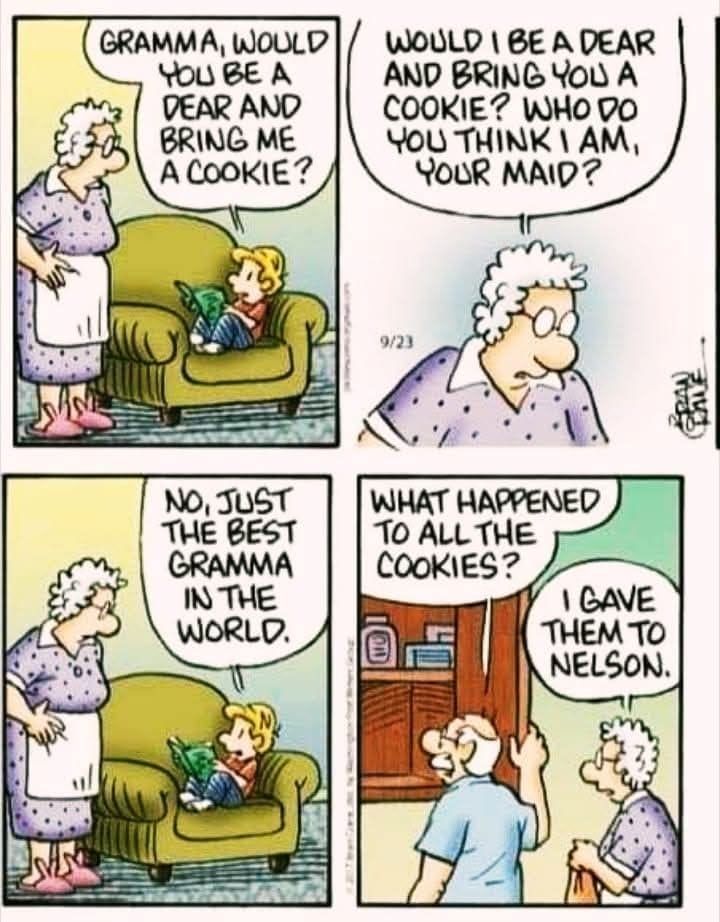 Nelson tries to sweet-talk his way to cookies, but Gramma’s not buying it. Her “maid” comeback is pure comic gold, and the cookie twist? Genius!
