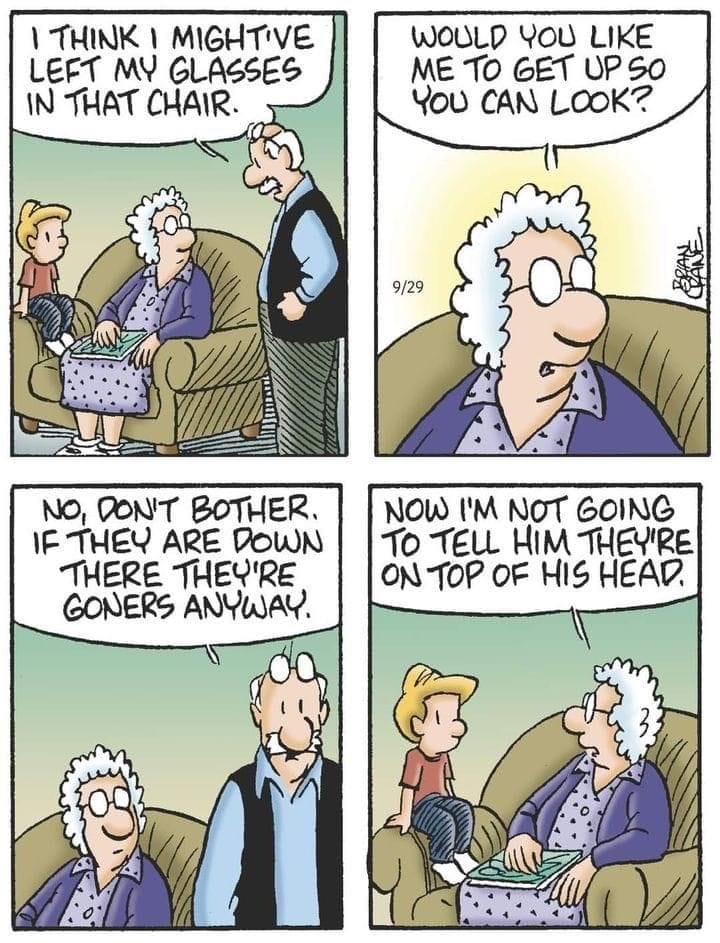 When your glasses are on your head but you give up looking altogether, it’s peak senior logic. And the kid wisely decides not to get involved.