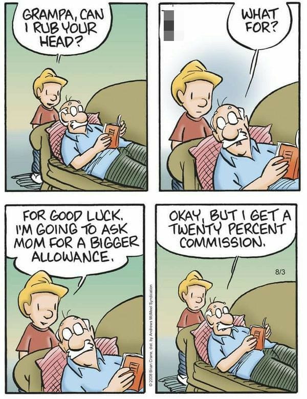 Nelson wants to rub Grandpa’s head for luck before asking for a raise. But Earl doesn’t work for free—he wants a cut. Hustle recognizes hustle.