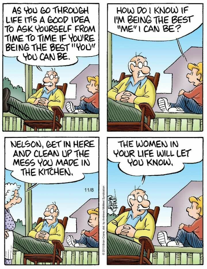 A profound life lesson is immediately interrupted by a reminder to clean the kitchen. Moral of the story: the women in your life will keep you humble.