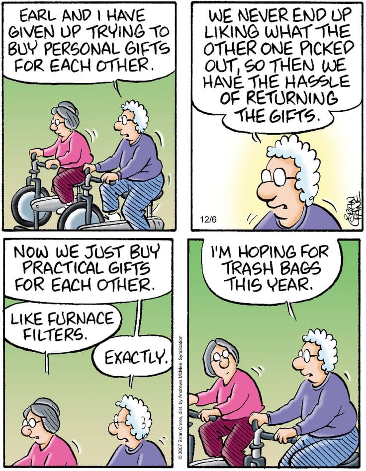 Romance evolves in long-term relationships. Forget jewelry—these two are gifting each other furnace filters and trash bags. Practical is the new passion.