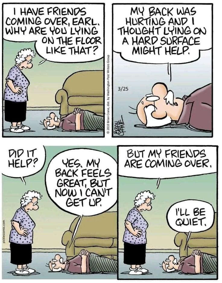 Lying on the floor for back pain is all good until guests arrive. Earl’s commitment to comfort vs. Opal’s social expectations = eternal sitcom energy.