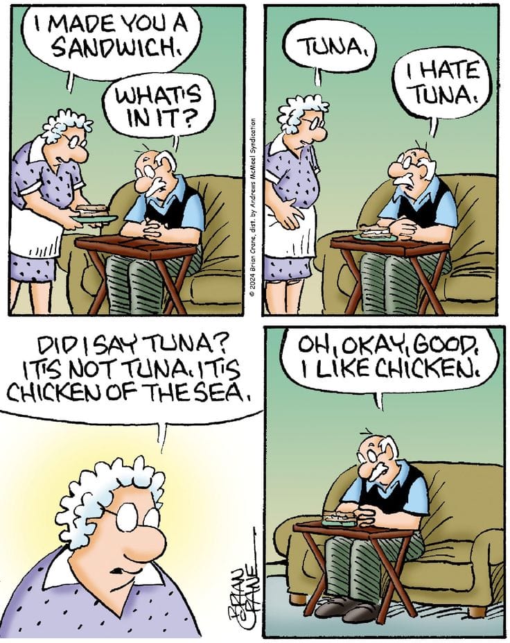 Opal makes Earl a tuna sandwich. He hates tuna. But when she calls it “chicken of the sea,” he’s suddenly fine. Branding really does matter.