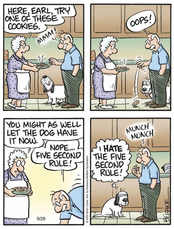 Earl drops a cookie. The dog stares hopefully. But Earl claims the “five-second rule”—and wins. Roscoe, however, is not impressed.