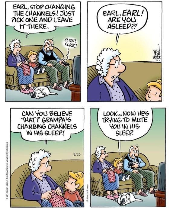 Falling asleep with the remote still in hand? That’s Earl’s special talent. Apparently, he can mute people in his dreams. Relationship goals?