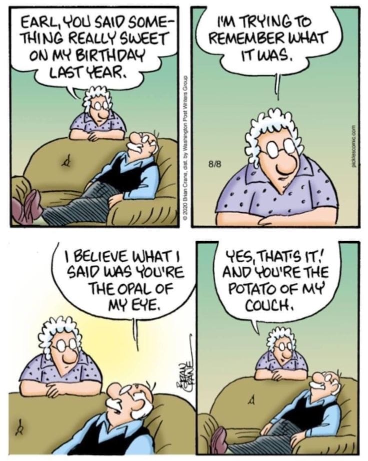 Sweet nothings, Pickles style: Earl’s romantic memory gets a slight twist, turning “opal of my eye” into “potato of my couch.” Marriage in a nutshell.