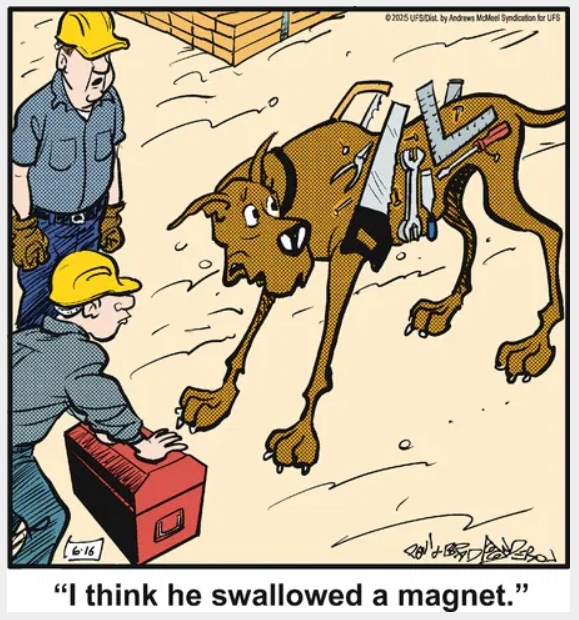 Worksite woes meet canine curiosity in this panel. Marmaduke is suddenly attracting every tool in sight—literally. The construction crew looks on in disbelief as their equipment becomes dog accessories. Leave it to Marmaduke to take “metal dog” to a new level.