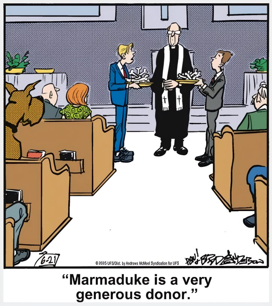 Church collection plate? Marmaduke takes it literally, offering up who-knows-what as his contribution. One thing’s for sure: his heart (and paws) are in the right place, even if his donation isn’t exactly currency.