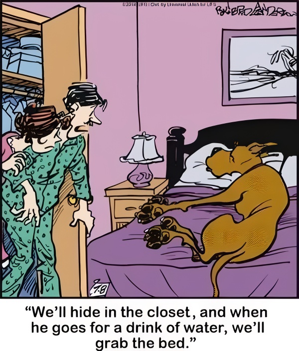 Operation reclaim-the-bed is underway. The only thing standing between the humans and a good night’s sleep? Marmaduke’s naptime routine. Spoiler: the humans never win.