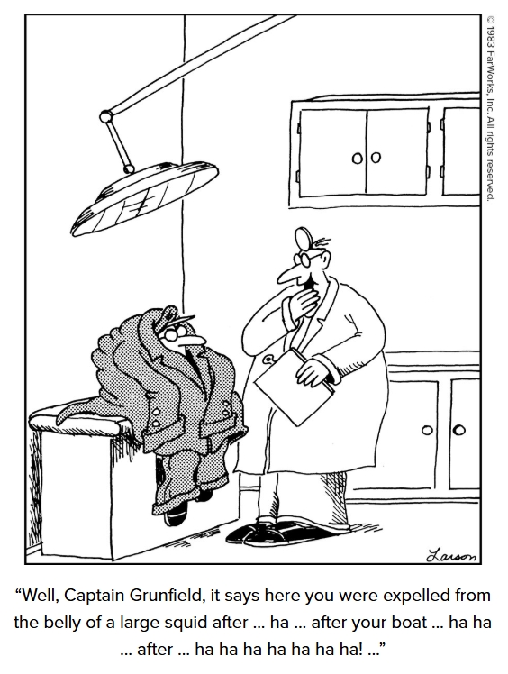 A visit to the doctor’s office takes a bizarre turn when your last adventure involved being expelled from a giant squid. The world’s weirdest patient history—no copay required.