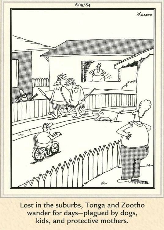 Jungle explorers meet suburbia—what could possibly go wrong? Larson finds hilarity in suburban wildlife, from territorial moms to feral kids. Suburbia has never looked wilder.