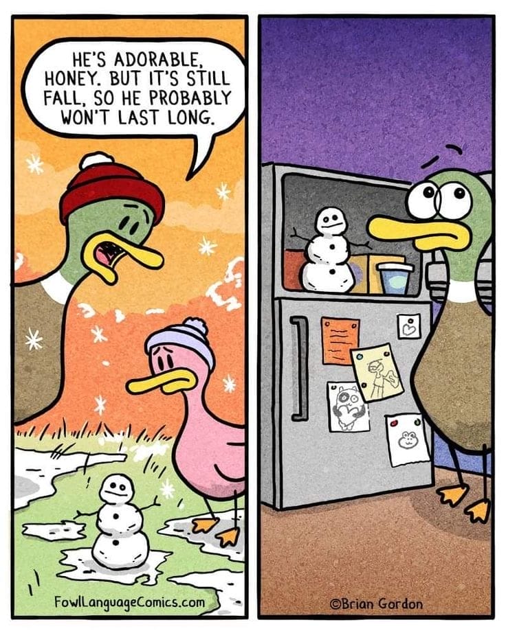 The snowman might not last in fall… so into the freezer he goes. This comic showcases a sweet mix of childhood logic and adult compromise. It’s oddly heartwarming and totally hilarious.