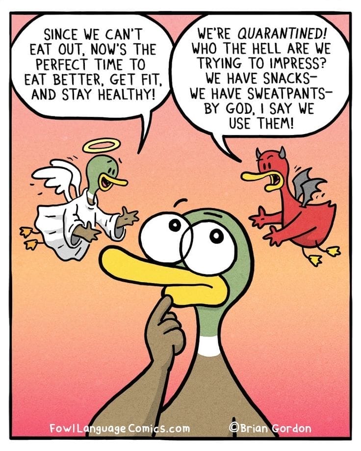 A brilliant quarantine-themed gag, this angel-devil shoulder battle is Gordon at his best. Who needs kale when you have snacks and sweatpants? This comic is a snack-fueled rebellion and we’re here for it.