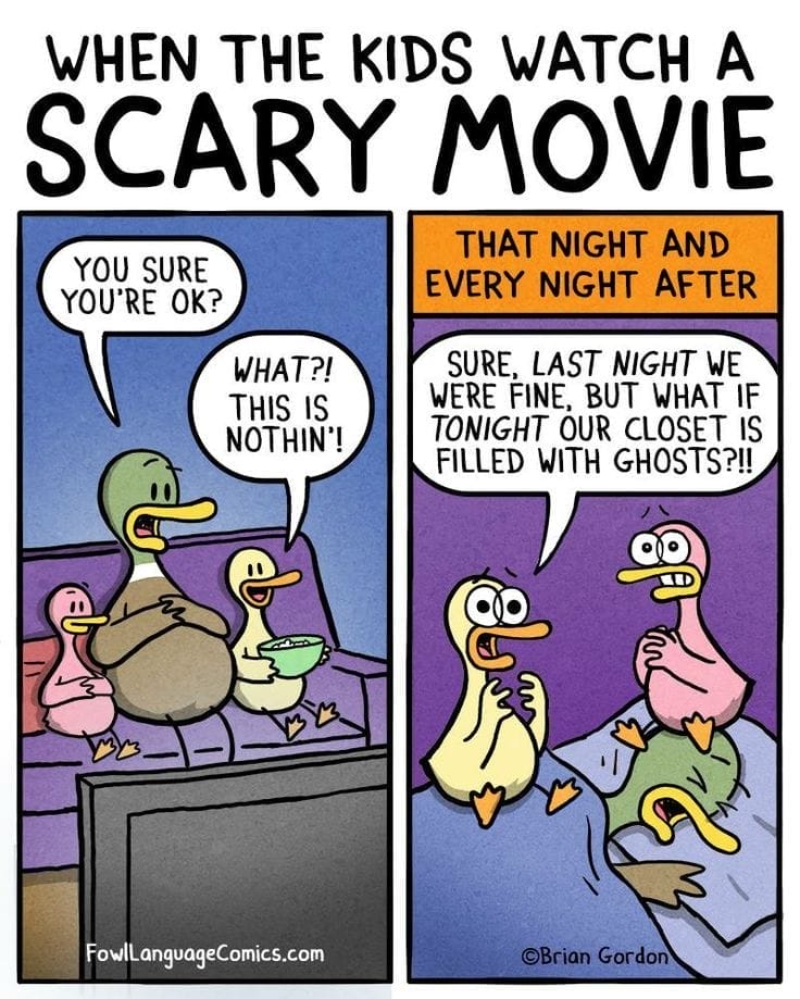 The kids were fine during the movie… until the panic hits at bedtime. “What if the closet is filled with ghosts?!” This comic shows how one movie night can ruin sleep forever—hilariously illustrated, of course.