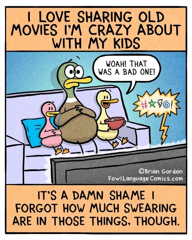 We’ve all shared a movie we loved as kids, only to be horrified by how much swearing we forgot. The comic’s expressions say it all—pure panic and nostalgia in one messy memory.