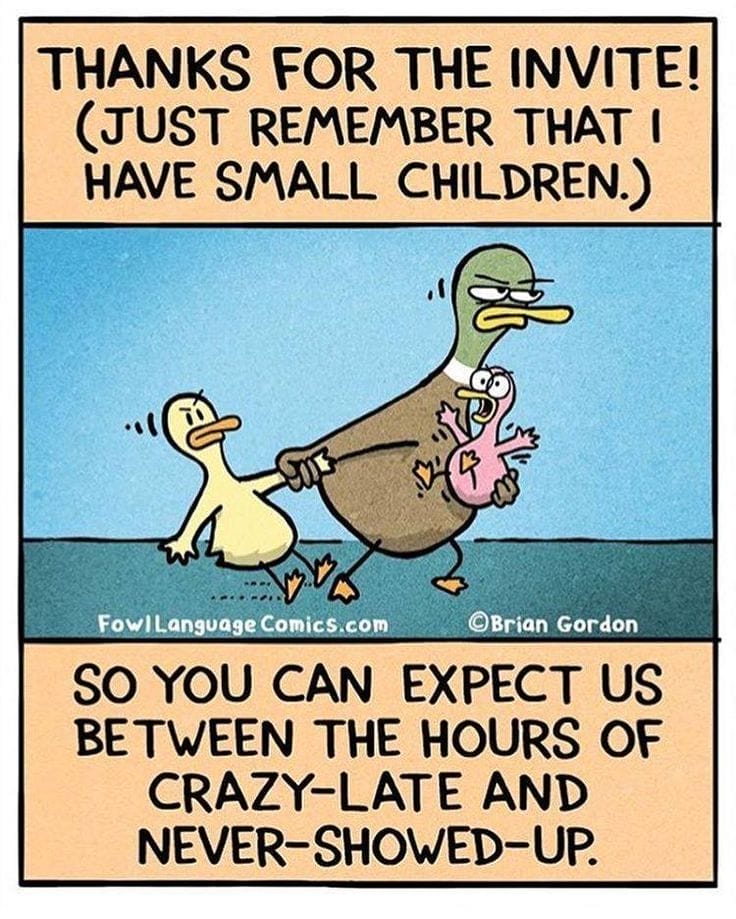 This one’s for the friends without kids who wonder why you’re late or absent. “Crazy-late or never-showed-up” is the new RSVPing with toddlers. Sharp, funny, and way too true.